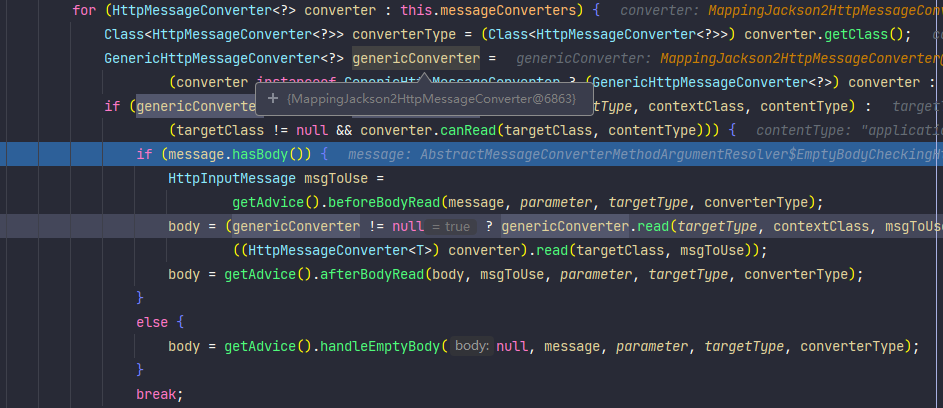 我们从这个方法一直跟进去,直到这个方法,从函数名称,我们大概可以猜出,这是将我们requestbody转换成对应controller上的参数