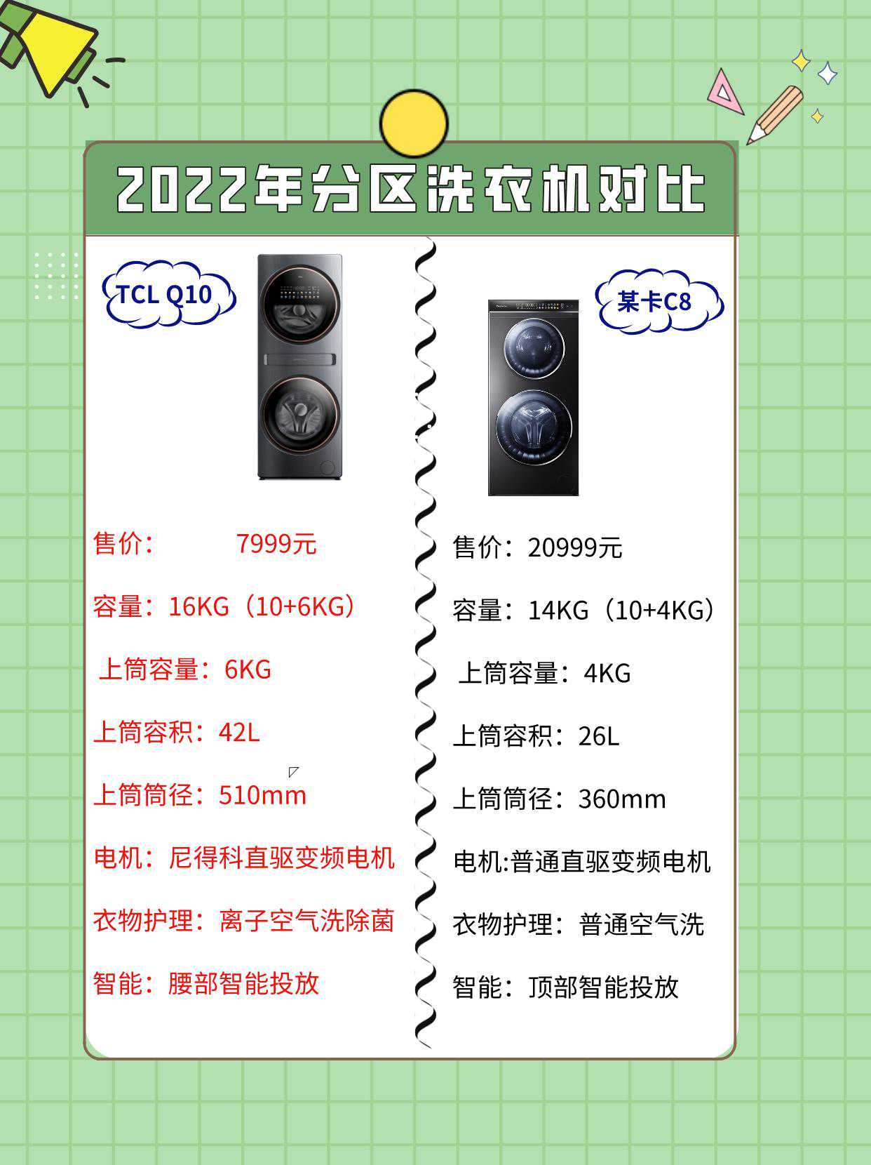 从我个人体验以及对产品性能的测评而言,TCLQ10的产品力配上7999的首发价绝对是物超所值,同样的价格层次可以秒掉任何一个竞品,其实对于新家购买需求的用户,其实我也建议你们一步到位买分区洗衣机,因为差不了多少钱。而卡萨帝虽然也是款值得信赖的品牌,但是20999的售价存在较大的溢价空间,想挑选一款高品质的复式分区洗衣机,没必要多花两万多的冤枉钱。