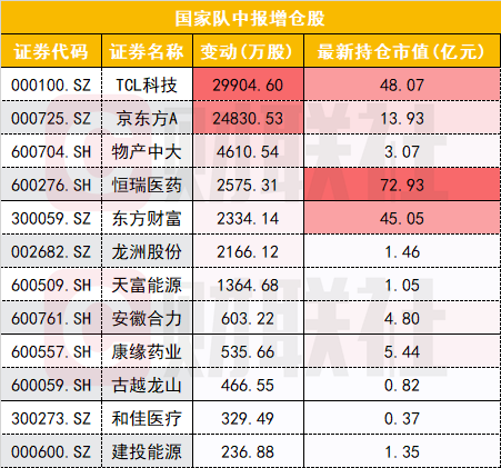 中报国家队增仓股共14只,其中TCL科技增仓近3亿股,京东方A增仓近2.5亿股;恒瑞医药增仓近73亿元。
