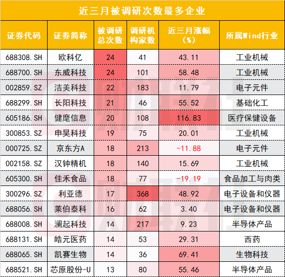 近三月被调研次数前15的上市公司平均涨幅33.74%,远高于同期上证指数涨幅0.84%。其中,欧科亿和东威科技并列第一,近三月被调研24次,相当于平均每周要被调研2次,且同属工业器械”专精特新“板块,作为次新股,两者市盈率属于行业平均水平,近三月涨幅分别为43.11%和58.48%。
