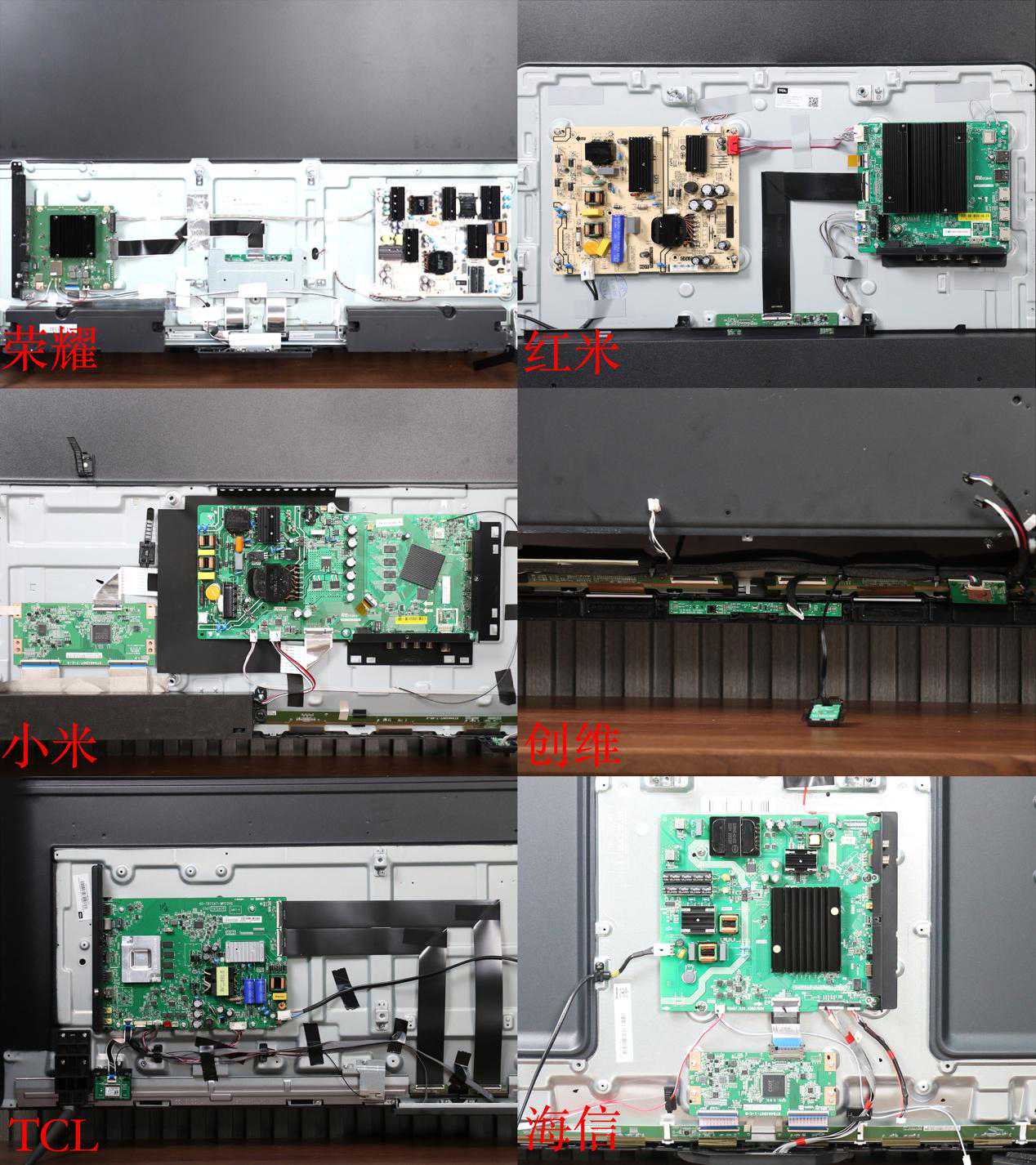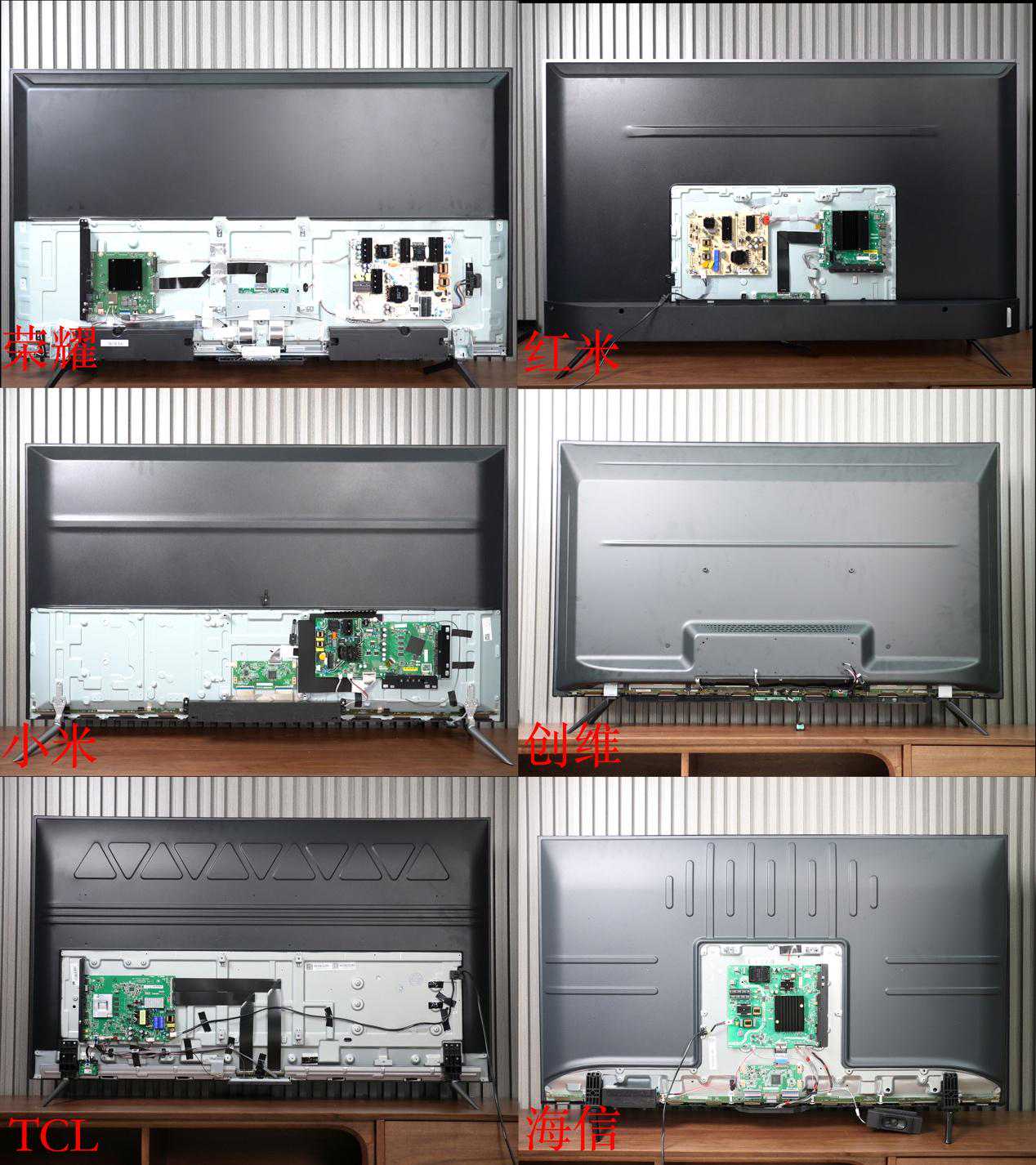拆机部分我们分为几个层面,由外及内从最简单的拆机难度到最后的电路板架构进行剖析,综合看看这六款电视的内部蕴藏的功力。