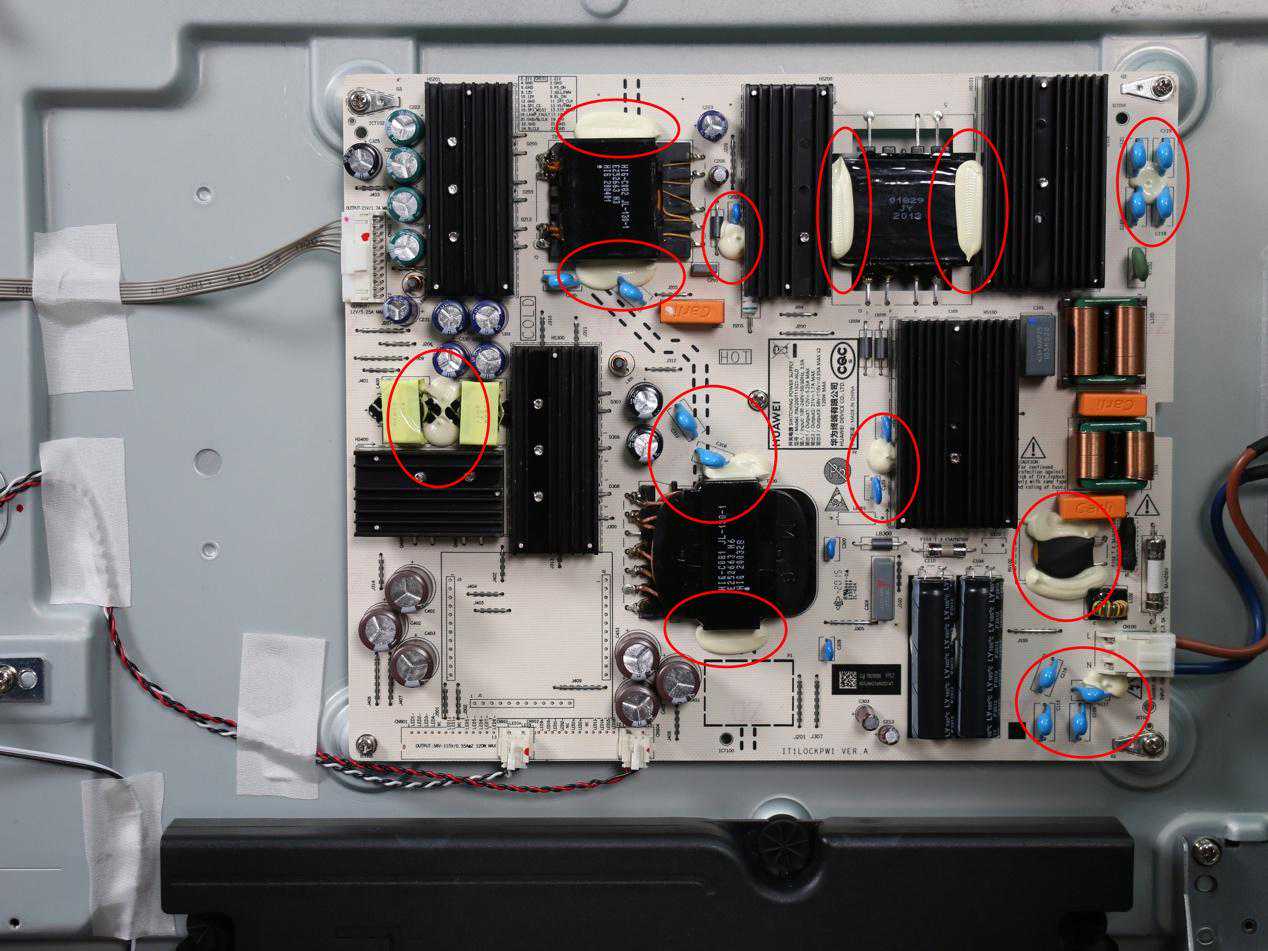 几款产品中,荣耀X1的点胶量无疑是最大的,肉眼可见的范围内都是白色的绝缘胶以及在触点上的蓝色点胶。其余几款产品中,RedmiX55的点胶量相对来说也比较多,但是和荣耀X1相比就有些小巫见大巫了,而小米、创维、TCL、海信这些品牌仅仅在触点上有蓝色点胶,在元件之间并未点胶,相对来说被外力冲击和被电流击穿的概率就要大很多。