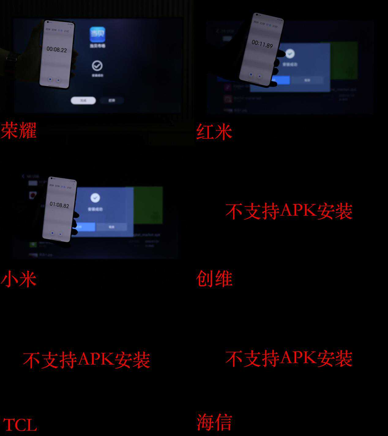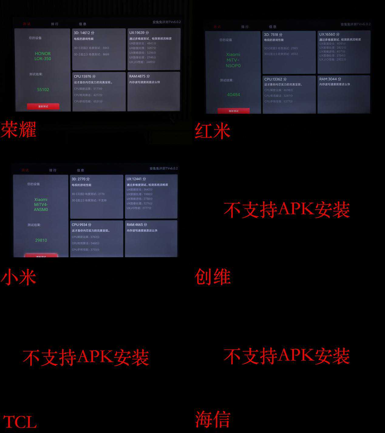 对于几款产品的芯片效能我们也进行了测试,以安兔兔TV版测试为基准,在APK安装方面,创维、TCL、海信三款传统电视品牌的产品不支持APK文件安装故无法进行测试,而荣耀、Redmi和小米三款互联网品牌在APK安装速度方面差别也比较大,小米全面屏电视的T962芯片由于型号较老,所以安装耗时最多,荣耀X1的鸿鹄818耗时最短,基本与手机端相差不大。
