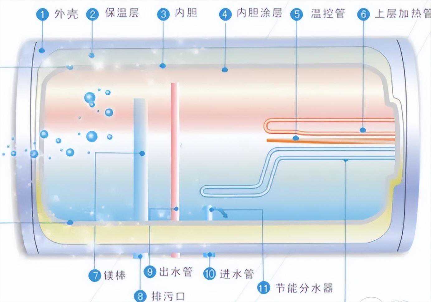 内胆既是盛水的容器,又是对外加热的场所,其寿命决定于内胆的材料和制造工艺。常见内胆材料有镀锌铁板、不锈钢板和钢板内涂搪瓷三种。