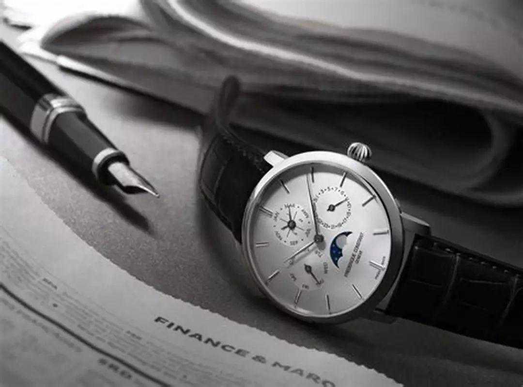 妹子为财务部男士挑选了这一款康斯登。纯白表盘与低调的黑色鳄鱼皮表带组合散发禁欲气息。42mm表盘物尽其用,分别搭载了星期显示、月份显示、日期显示及月相显示。众多功能集合一体却井然有序,搭载FC-775机芯及38小时动力储存,符合财务男心中的规范与严谨了吧。
