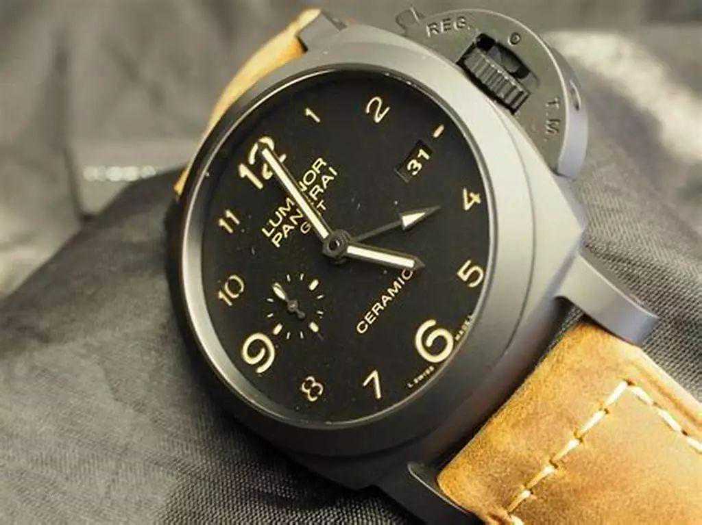 这款带点骚气的沛纳海很适合程序猿们呐,打破呆板沉闷,兼具时尚与粗犷。表款设计灵感取材于第二次世界大战的军用腕表。夜光数字刻度在纯黑表盘异常醒目,6、9、12被放大,整个刻度圈呈现闪烁效果。9点方向的小盘承担双时区功能,与之对应的3点方向则是日历显示。