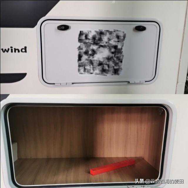 车身左侧尾部则是一个1500*700*600(mm)的大型储物仓,可存放出门远行的大部分物资,随车维修工具以及警示三角架也放在了这里,由于竖床布局影响储物仓非左右贯通。重点是全车舱门和加水口以及乘客门共用一把钥匙,解决了房车用户一大痛点问题——一台车一大串钥匙。