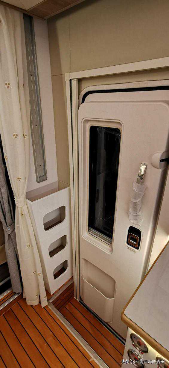 厨房区域配有一个意大利进口CAN带翻盖的洗菜盆、单眼电磁炉、抽油烟机等基础设施。左侧上部分是乘客门拓乐电动踏步开关、发电机控制面板、五孔插座以及其他设备控制开关,下方两个格子则是鞋柜带锁止机构,一家人的鞋子完全满足,不过笔者建议在这里放拖鞋。正面下方则有主副水箱、灰水箱、黑水箱的容量计,五个分区的带锁止储物柜,可以存放一家子的餐具以及烹饪所需的锅碗瓢盆。窗户上方的四个可折叠隐藏挂钩可以挂一些平时擦桌子的抹布,图中为乘客门内防蚊门开启状态。