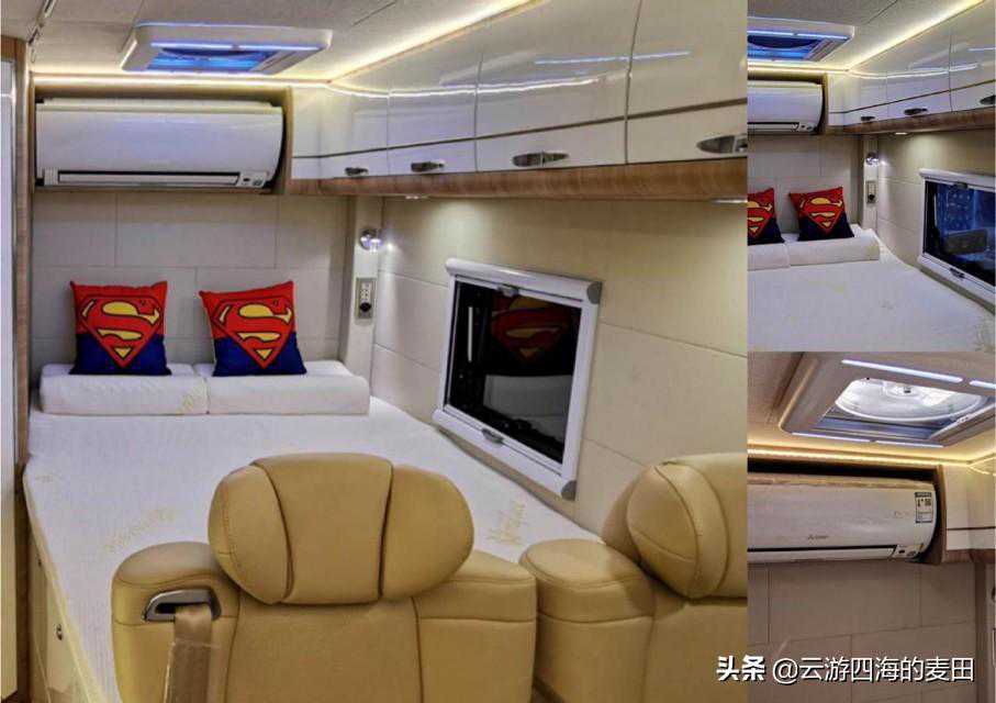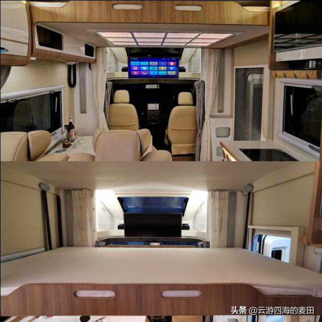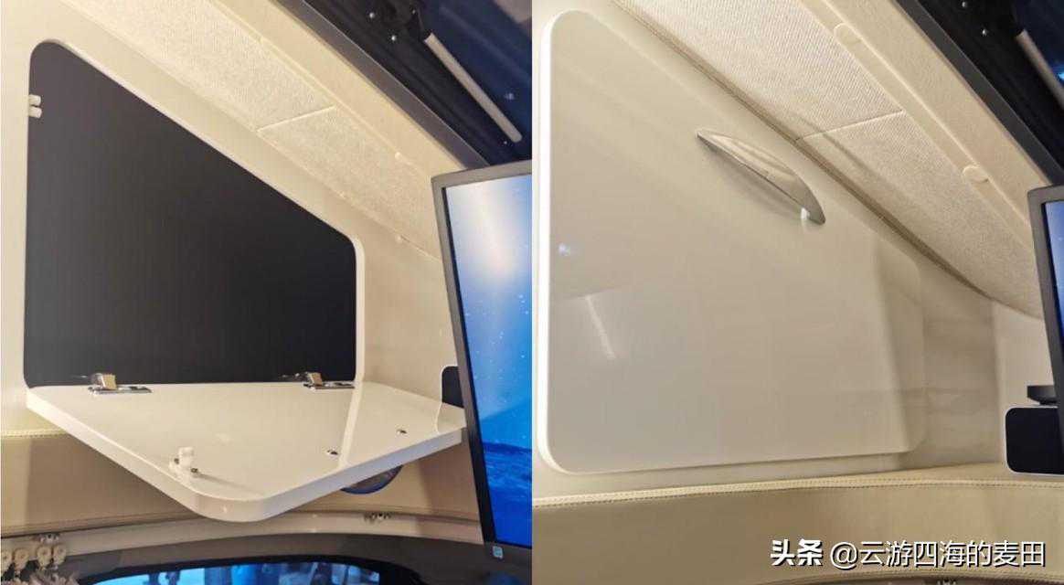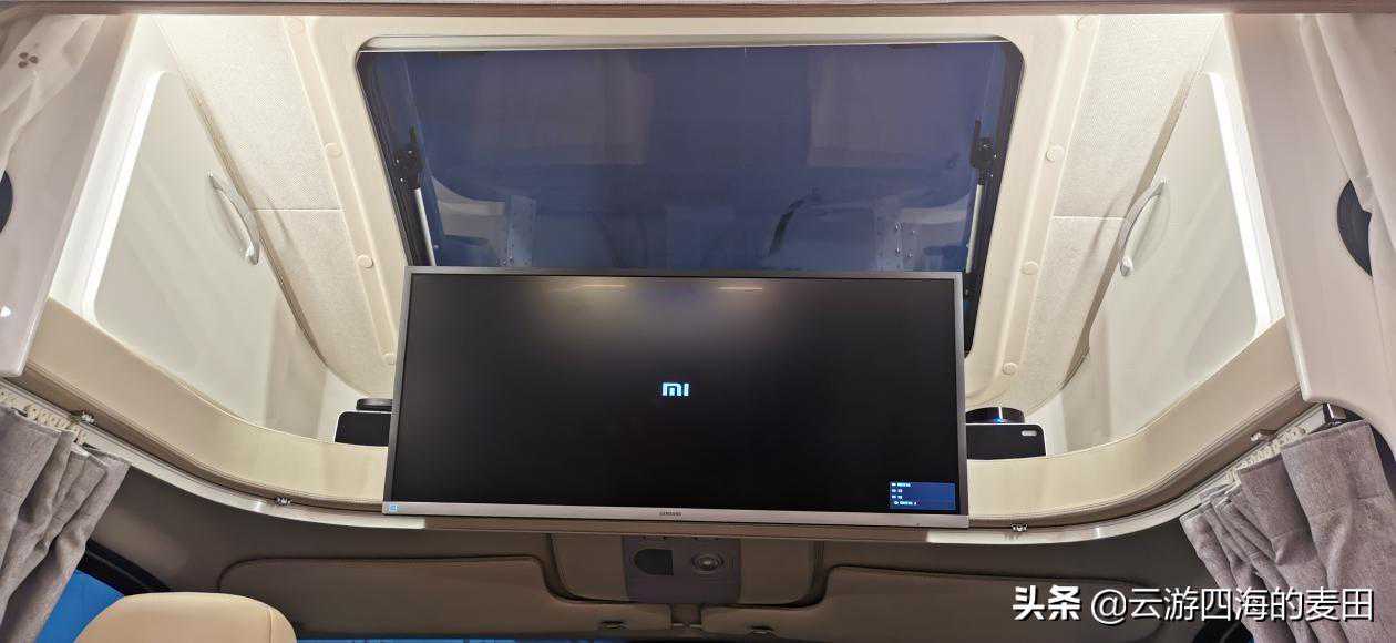 得益于小额头的设计,额头两侧设置了两个带锁止机构的储物柜,中部是一台34寸的三星4K液晶显示屏背部则有与显示屏配套的小米盒子和小米音响,对于喜欢看电影的人来说这是个不错的配置,整车的DSP八路功放,低音炮,前主动两分频加上A柱高音倒模,对于音乐发烧友而言内心会不会引起大幅波动呢。显示器下方还有一条隐私帘轨道,夜晚休息时可将绑在一侧的隐私帘往中间拉。网络科技高速发展的今天,我们对网络已经产生了超高依赖,对此该车配有4G华为315无线路由器。小额头中间还有一个大天窗,弧度与额头完美融合,不会增加风阻的同时也增加了车内采光,夜晚打开天窗便是漫天星空。
