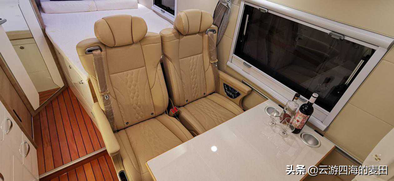 航空座椅并未配备脚托,主驾驶后方设置了一个类似长条凳的设施,既可充当脚托也可以座在那里,形成一个四人会客区,主驾驶空间受限并不具备旋转功能。桌子上的两个杯架,可在行驶途中固定水杯饮料又或者是酒杯。航空座椅配有预紧限力三点式安全带,满足法规核载人数要求,同时保障乘客生命安全。