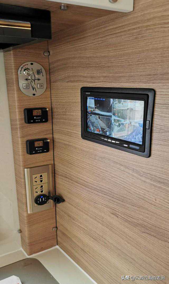转角处设有两个五孔插座以及USB12V接口,方便煮水壶、豆浆机、面包机等设备插电使用。上方则是电动吊床的控制装置,为确保意外的发生,启动电动吊床需先插入钥匙,有效防止儿童误触发生意外,旁边则是远程四路监控车内显示屏。电路方面该车配有12V1000AH磷酸铁锂电池组,3000w工频充逆变一体机,150A+150A双行车发电机,3000w虹晟达车载底挂汽油变频静音发电机机组,500w汉能薄膜太阳能板(含MPPT控制器)。
