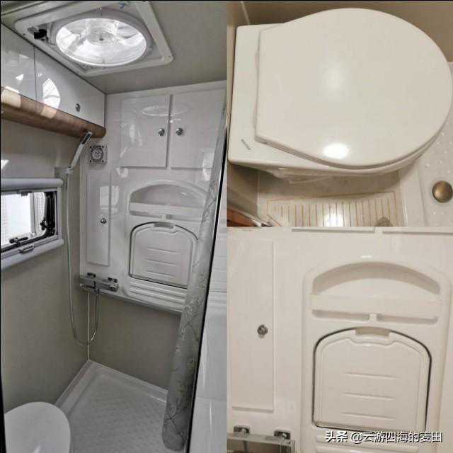 生活区尾部右侧是干湿一体式卫生间,配有Thetford(赛特福德)Compass型电动粉碎坐便器带电动粉碎功能,得益于强劲的粉碎排污泵,污水可以被水平抽送至45米,垂直提升4米。尾部一侧配有折叠翻转洗手盆以及恒温混水沐浴系统,恒温淋浴龙头的作用是将热水和冷水自动混合成预先设定的温度的温水。具有能迅速锁定水温并能保持适合使用者喜爱的恒定水温,极大的提高了淋浴的安全性及舒适性,避免了使用普通淋浴花洒因水压或热水源问题引起的淋浴中可能出现的水温忽冷忽热现象。水路系统这款车配有350L双清水箱(220L车外主清水箱、130L车内副清水箱)、80L黑水箱带电控排放;Seaflo(赛福乐)主副压力水泵(带5L压力罐),有效减少水泵启停次数,同时可有效吸收加热器产生的多余热量,水流充足,压力适当,享受与家中一样的用水自由与舒畅;主管路标配Wheeelton(惠尔顿)中央净水器;热水由Aibeher(埃贝赫)5000w水暖装置提供,为确保高原使用还有一组15L储水式电热水器。