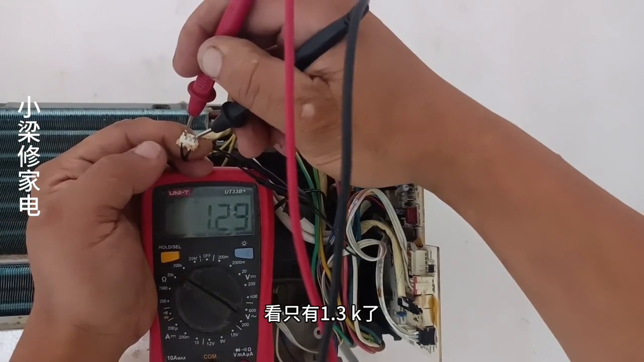 我们在外机观察了一下,发现并不缺冷煤,但是观察了十多分钟后,空调果然出现了a13故障。这个故障很明显是由于内机管温异常引起的。但是我们的检查流程不能省略。这就是内机管温,新科空调的内机管温一般为十k,我们可以使用慢用表测量其电阻值,看,只有一点三k了,显然不正常。现在我们需要与客户协商维修费用。