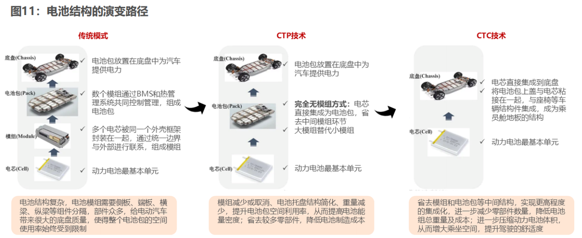 电池结构的演变可分为模组标准化(电芯-模组-电池包)、CTP(大模组、去模组化)、CTC/CTB(电池底盘、车身一体化)三个阶段。