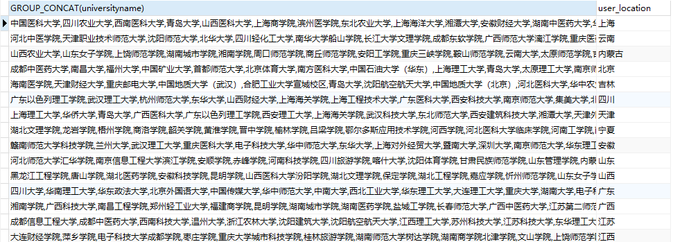 selectGROUP_CONCAT(universityname),user_locationfromtbl_admission_by_rankwhereuser_rank=12000GROUPBYuser_location