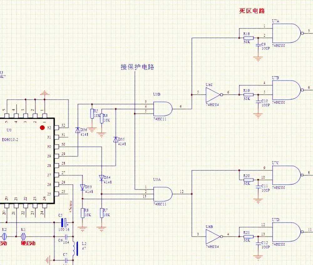 第一个问题:8010的最大死区时间只有1.5US,而这些大模块,因为输入电容比较大,需要有比较大的死区时间,有时可能要放大到3US以上,才能安全工作。为了解决这个问题,我把8010的输出接法做了较大的改进,先把8010输出的4路用与门合并成2路,做成象张工的22851093这样的时序,再把二路SPWM分成4路,用与非门做成硬件死区电路,这样,死区时间就不受8010内建死区的限止了,可以随意做到几US。