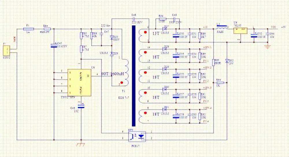 因为,一般大功率的机器,前级和后级可能是分离的,对于后级来讲,一般是接入360V左右的高压,就要能工作,所以,这个驱动卡的辅助电源是高压输入的,我用了一块PI公司的TNY277的IC,电路比较简单,但输出路数很多,有5路,都是互相隔离的。因功率不大,可以用EE20EFD20等磁芯,但这类磁芯,找不到与它匹配的脚位有6+6以上的骨架,所以,只得用了EI28磁芯,用了11+11的骨架。下图是辅助电源部分的电路和TNY277的D极波形。