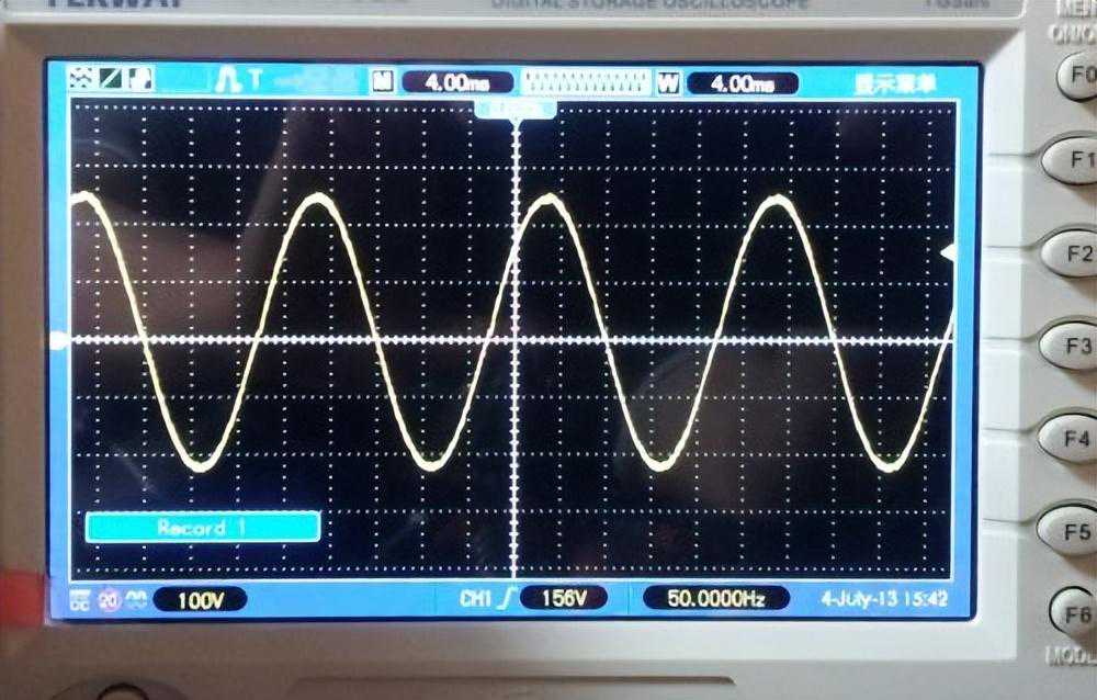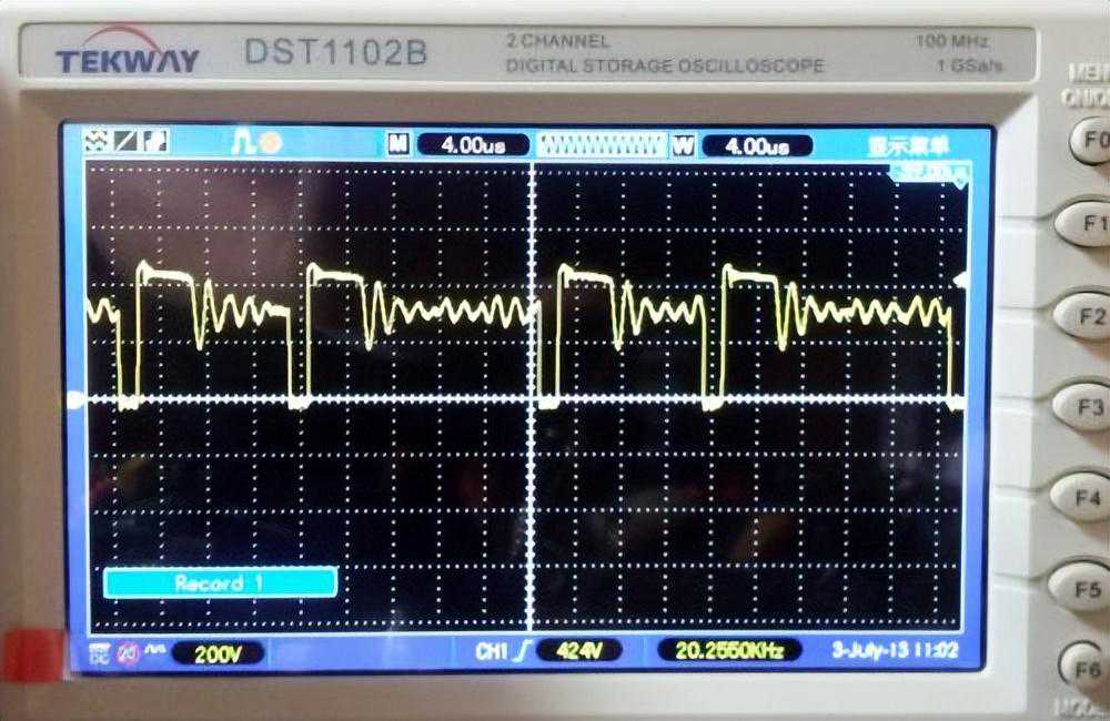 下面是这款驱动卡联上300A模块的图片,四路输出的图腾管是用D1804和B1204,输出电流8A,在连上300A模块时,G极上升时间约为380NS左右(G极电阻10R),不算很快,但也不算特别慢了。我在模块上接入30V的母线电压,输出的正弦波如下图,可见,设计上没有明显的错误,时序也是对的。