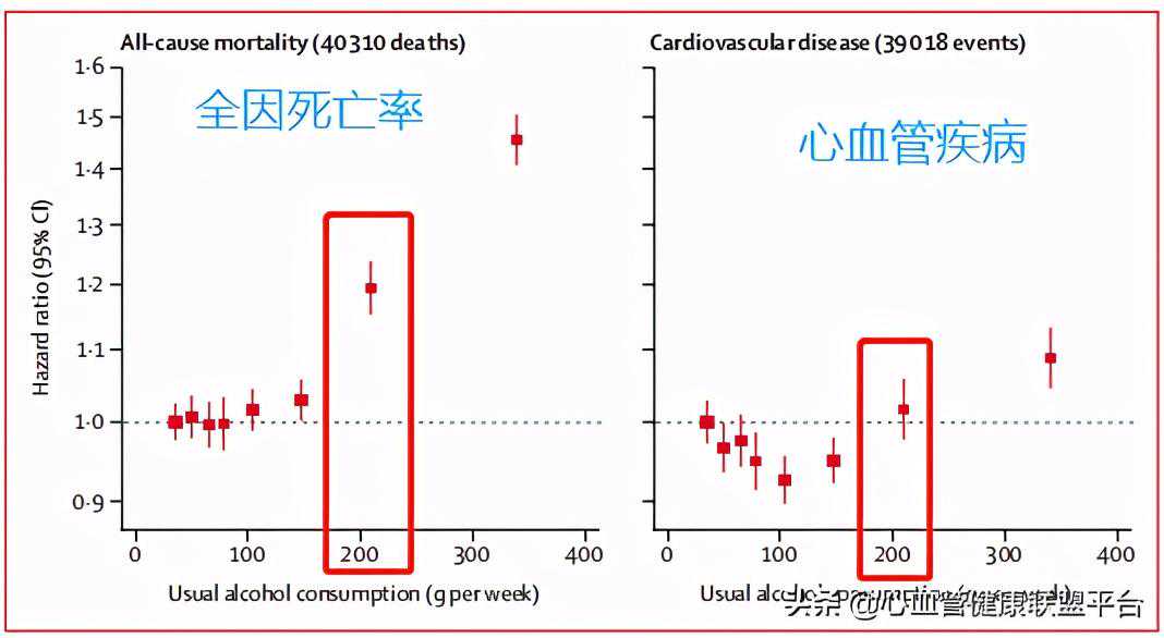 2018年,发表在世界四大医学杂志之一《Lancet》上的一项分析研究,纳入了83项前瞻性研究的近60万人。结果发现,每周饮酒在200g以上,会明显增加日后的全因死亡率,以及心衰、卒中、心血管疾病的发生风险。