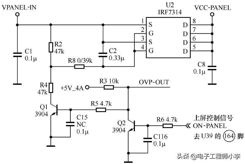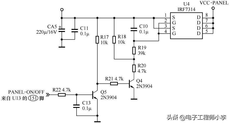 PANEL-ON/OFF指令经Q5和Q4两级倒相后加到U4内部MOS管的G极,该MOS管为P沟道增强型,Vgs为负压时便导通,从漏极⑤~⑧脚输出供屏驱动工作的电压。
