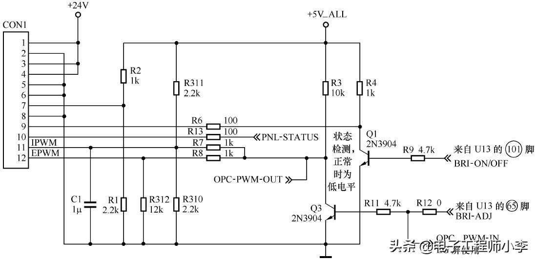 背光灯开关和亮度控制电路如图3-2-8所示。开机时,从U13的101脚输出逆变器开关控制信号,Q1截止,在C极得到约5V的高电平,通过CON1的③脚输往逆变器,打开逆变振荡器,逆变器正常工作。另一路由软件对图像信号处理后,从65脚输出PWM亮度控制信号,Q3截止,通过CON1的①脚输往逆变器实现自动调光。OPC功能在LG屏使用,作用是进行亮度调节,该信号与上屏接口相连。