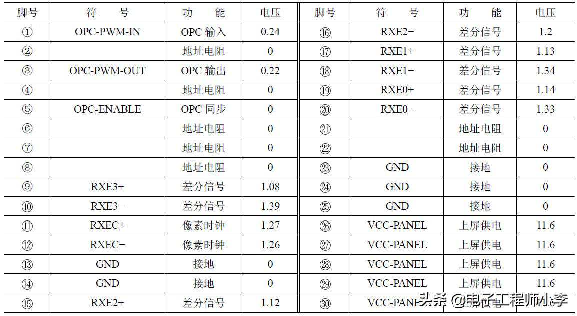 表3-2-1LVDS上屏接口功能及维修参考数据(单位:V)