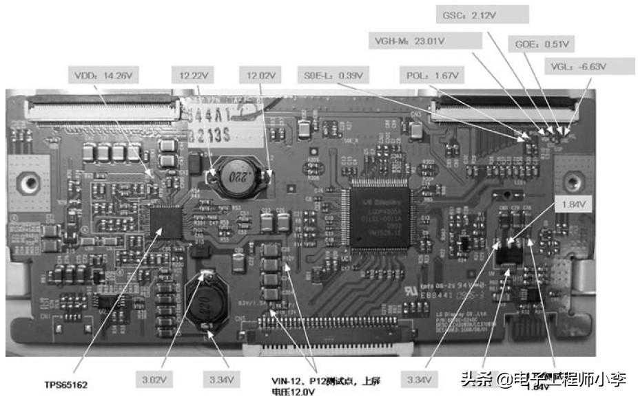下面以LG公司生产的LC370WXN-SBC1屏所配逻辑板为例进行举例,该逻辑板各测试点正常工作电压如图3-2-10所示。