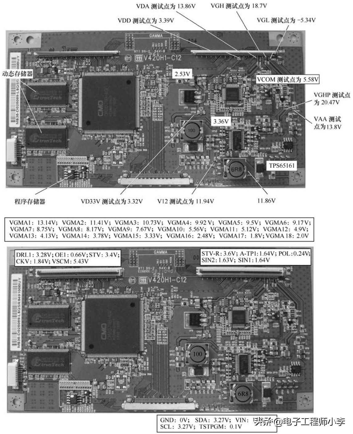 下面以奇美公司生产的V420H1-C12屏所配逻辑板为例进行举例,该逻辑板各测试点正常工作电压如图3-2-11所示。
