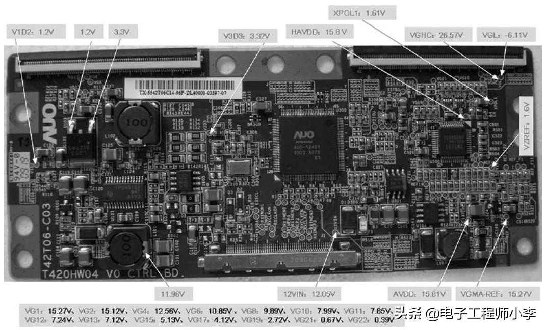 下面以AU公司生产的T420HW04-V0屏所配逻辑板进行举例,该逻辑板各测试点正常工作电压如图3-2-12所示。