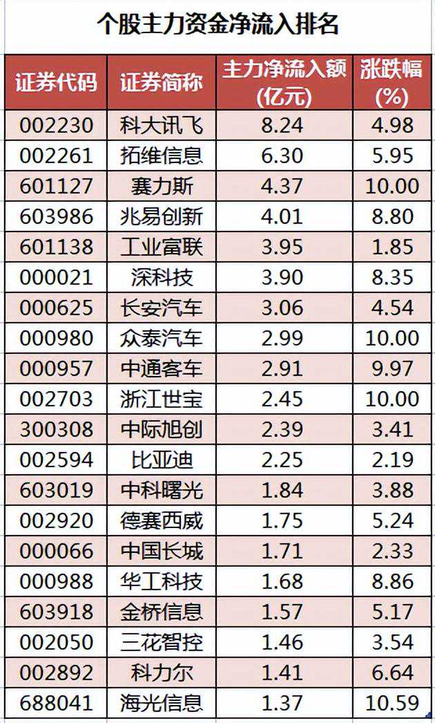 个股来看,今日有1733只个股获主力资金净流入,其中,33股获主力资金净流入超1亿元。科大讯飞获主力资金净流入最多,净流入金额为8.24亿元;主力资金净流入居前的个股还有拓维信息、赛力斯、兆易创新、工业富联、深科技,净流入金额分别为6.3亿元、4.37亿元、4.01亿元、3.95亿元、3.9亿元。