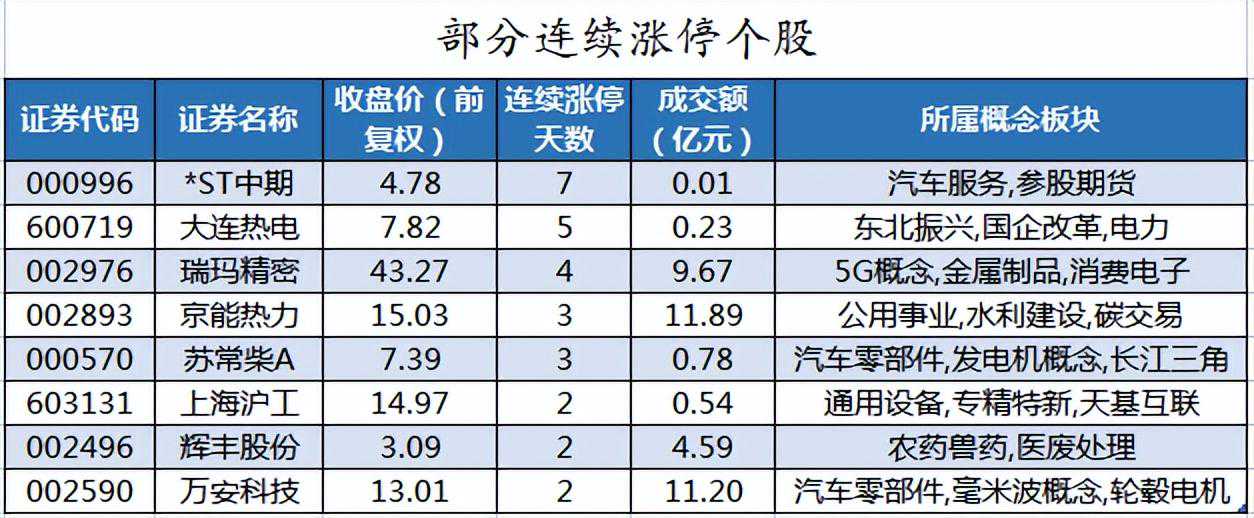 截至收盘,沪深两市合计3508只个股上涨,1293只个股下跌,平盘个股201只,停牌的个股15只。不含当日上市新股,共有47只个股涨停,5只个股跌停。续涨停天数看,*ST中期已连收7个涨停板,连续涨停板数量最多。