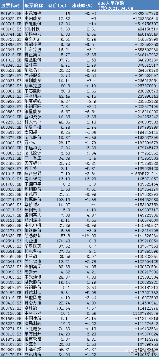 4月8日大单资金净流出超亿元的个股: