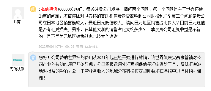有投资者比较担心海信对世界杯的赞助费用会影响到其利润。对此,海信视像在上证e互动回应称,其赞助世界杯的费用从2021年起开始进行摊销,该世界级顶尖赛事营销对公司产业的拉动作用已开始显现。