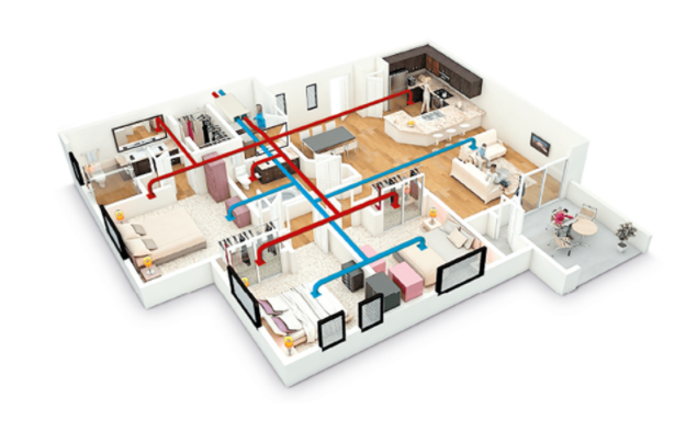 管道式新风系统由新风机和管道配件组成,新风机通过新风管道将净化后的室外空气导入室内,并通过管道将室内空气排出形成风道通路;前面所说的双向流新风机大多是此种类型,并具备两套进排气管路和热交换功能,结构复杂造价成本高,适合于装修初期就入场施工的家庭安装。