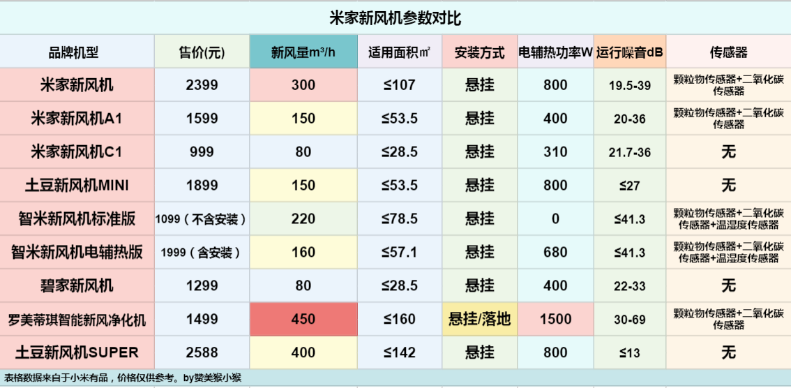 2。在150m³左右的四款新风机中,南方地区首选无电辅热版本的智米新风机,初次购机成本更低,南方地区使用时长更短,因此后期耗材成本可以相对降低。而三款电辅热新风机中,土豆MINI的后期耗材成本最低,且可以分级别更换滤网,适合于全年空气质量更差的北方地区,同时土豆MINI的电辅热功率也是最大的,噪音最低。因此,智米标准版和土豆MINI最具性价比。