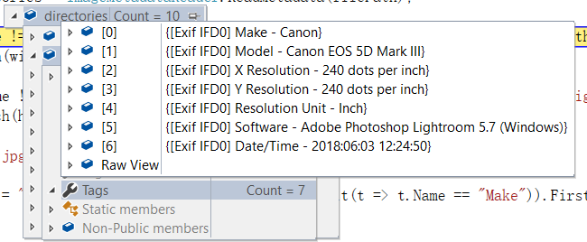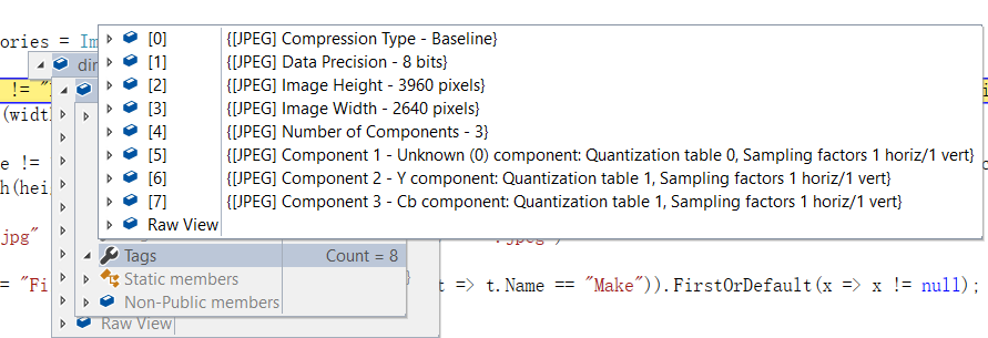 =(filePath);stringwidthStr=(s=!="File").Select(k=(t==="ImageWidth")).FirstOrDefault().Description;dr[ColNameOfImageWidth]=((widthStr,"\\d+").Value);stringheightStr=(s=!="File").Select(k=(t==="ImageHeight")).FirstOrDefault().Description;dr[ColNameOfImageHeight]=((heightStr,"\\d+").Value);if((filePath).ToLower()==".jpg"||(filePath).ToLower()==".jpeg"){varmaker=(s=!="File").Select(k=(t==="Make")).FirstOrDefault(x=x!=null);if(maker!=null){dr[ColNameOfMake]=;}varmodel=(s=!="File").Select(k=(t==="Model")).FirstOrDefault(x=x!=null);if(model!=null){dr[ColNameOfModel]=;}varpicDate=(s==="ExifSubIFD").(t==="Date/TimeOriginal");if(picDate!=null){stringstr=;if(!(str)){dr[ColNameOfPicDate]=((0,10).Replace(':','-')+(10));}}varjingdu=(s=!="File").Select(k=(t==="GPSLatitude")).FirstOrDefault(x=x!=null);if(jingdu!=null){stringstr=;MatchCollectionmatchCollection=(str,"\\d+");dr[ColNameOfLatitude]=(matchCollection[0].Value)+(matchCollection[1].Value)/60.0+(matchCollection[1].Value)/60.0/60.0;}varweidu=(s=!="File").Select(k=(t==="GPSLongitude")).FirstOrDefault(x=x!=null);if(weidu!=null){stringstr=;MatchCollectionmatchCollection=(str,"\\d+");dr[ColNameOfLongitude]=(matchCollection[0].Value)+(matchCollection[1].Value)/60.0+(matchCollection[1].Value)/60.0/60.0;}varhaiba=(s=!="File").Select(k=(t==="GPSAltitude")).FirstOrDefault(x=x!=null);if(haiba!=null){stringstr=;dr[ColNameOfAltitude]=(str,"\\d+").Value;}简单给大家看下Exif读取到的信息。