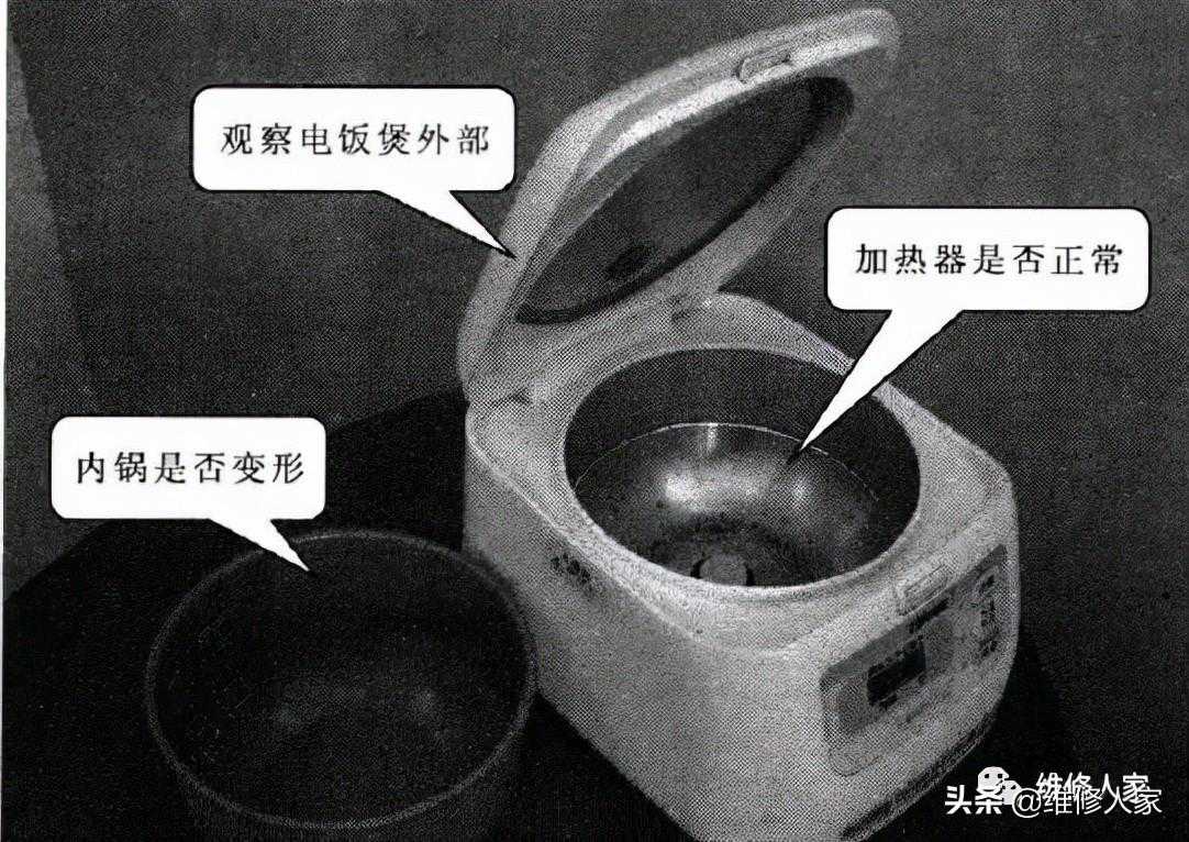 “观察法”是检修最常用的一种检测方法。在电饭煲故障的分析和推断过程中,可以采用观察法检测电饭煲的主要零部件,如观察内锅是否有变形、加热器(电热盘)表面是否有异物,如下图所示。