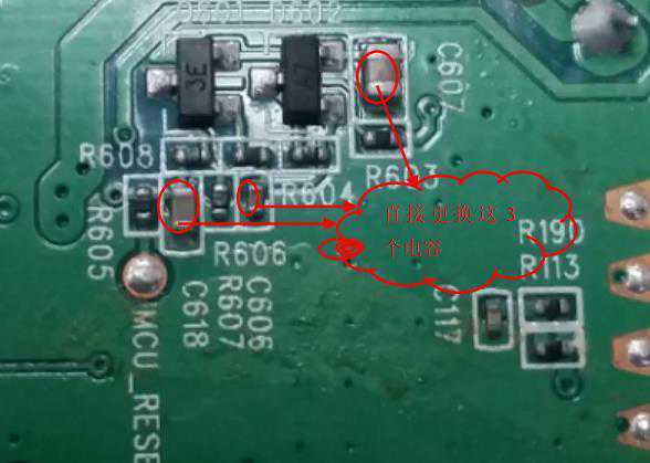 这是就怀疑复位电路是否有问题,于是测量了一下复位脚的电压,有3.3V,是不对的,然后开始检测复位电路的外围电路,发现有几个贴片电容,怀疑是电容漏电造成的,于是就把这几个电容给更换了一下,位号是,C607,C618,C606,更换完以后再次开机测试,机器正常,于是又用加热的方法测试,电视机没有再出现自动关机现象,说明就是电容漏电造成的自动关机。如图