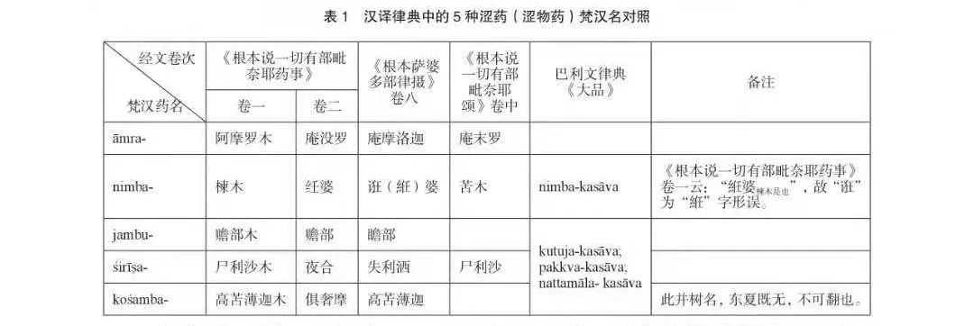 值得注意的是,梵本中的“āmra-kaṣāyāḥpūrvavat”意思是“如上所说的庵没罗诸涩药”,可见这是一个省略句式,表示承前省略,而汉译本中却再次详细地列出了五种涩药的名称。所以,梵本中的pūrvavat(如前所述、如上文所说)之类的省略方式是如何翻译的,必须依赖梵汉文本的对勘才能清晰。由上述的梵汉对勘可见,“尸利沙(木)”和“夜合”就是梵语Śirīṣa的对译。印度佛教僧团中,患病的僧人使用该植物的皮、叶等物,以水煮涂身,用来治疗疮疥等类的皮肤病。又,义净译《根本萨婆多部律摄》卷八中也列出了同样的五种涩药: