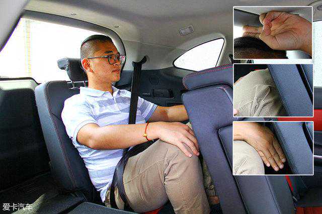 保持前排座椅位置不变,相同体验者来到第二排,将座椅移至最后位置,腿部空间约为一拳三指,头部空间约为一拳。