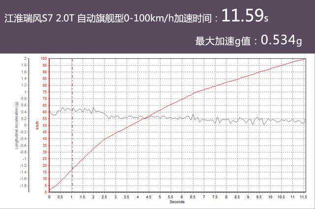 关闭车身电子稳定系统,并将变速箱挂入S挡,但是由于双离合变速箱的保护程序,起步转速被限制在1800rpm。起步的瞬间,动力的跟进有非常明显的迟疑,除了上文提到的涡轮迟滞外,还有保护变速箱的原因。在不到1s的迟滞之后,是动力突如其来的爆发,轮胎轻微的打滑,但之后的加速感比较平淡,全程共经历两次换挡。由于双离合变速箱发热的问题,起步时的迟滞越来越明显,测试成绩也一次不如一次。当天38℃的高温,对涡轮增压发动机以及双离合变速箱来说,已经算是相当严苛的工况。最终测得的最快加速成绩为11.59s。