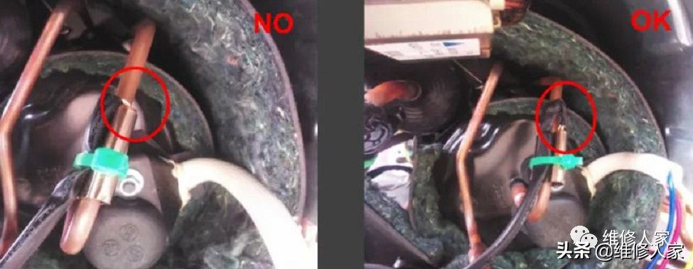 8、压缩机线和地线要用橡胶块等和管路隔开固定,防止线碰管路磨破漏电;