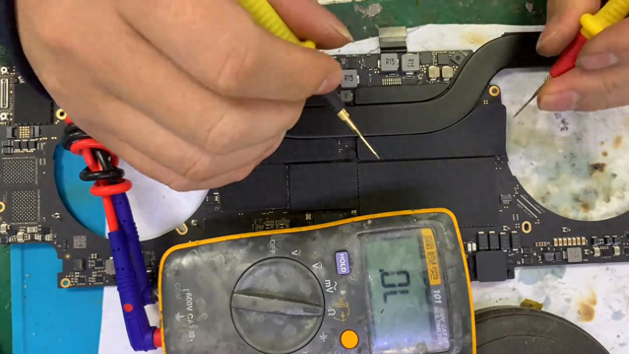 苹果十六寸的电脑a2141正常使用不开机,今天看看是什么问题。插电看看是什么问题,通电只有5v没有20的升压,这种是开不了机的。通常情况下不是后期有短路或者芯片工作条件不满足就会这样。拆除主板测量主板......