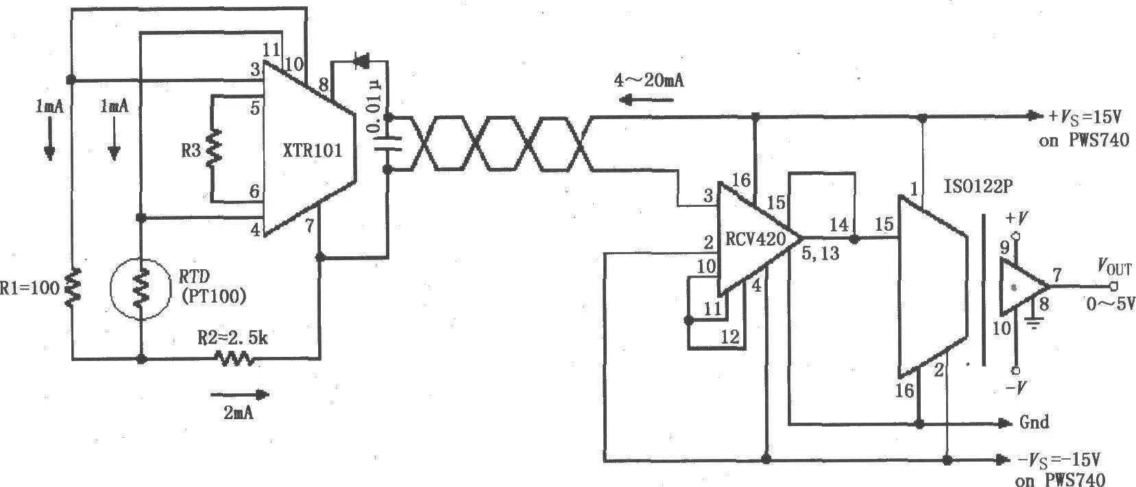 如图所示为由ISO122P/124与环路电流发送电路XTR101、环路电流接收电路RCV420构成的隔离式RTDs检测4~20mA环路仪器放大电路。电阻式温度检测器(RTD)检测温度变化,将温度变化转变为电信号输入XTR101,由XTR101变换为4~20mA电流输出,经过双绞线传输,由RCV420接收,再将4~20mA电流转换为电压信号,放大后送到隔离放大器ISO122P,由ISO122P隔离放大后输出0~5V电压。