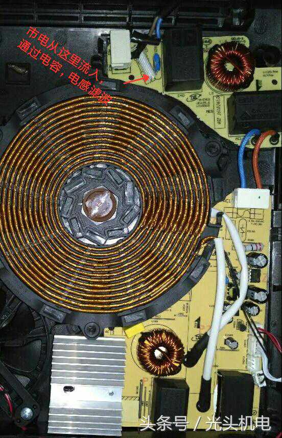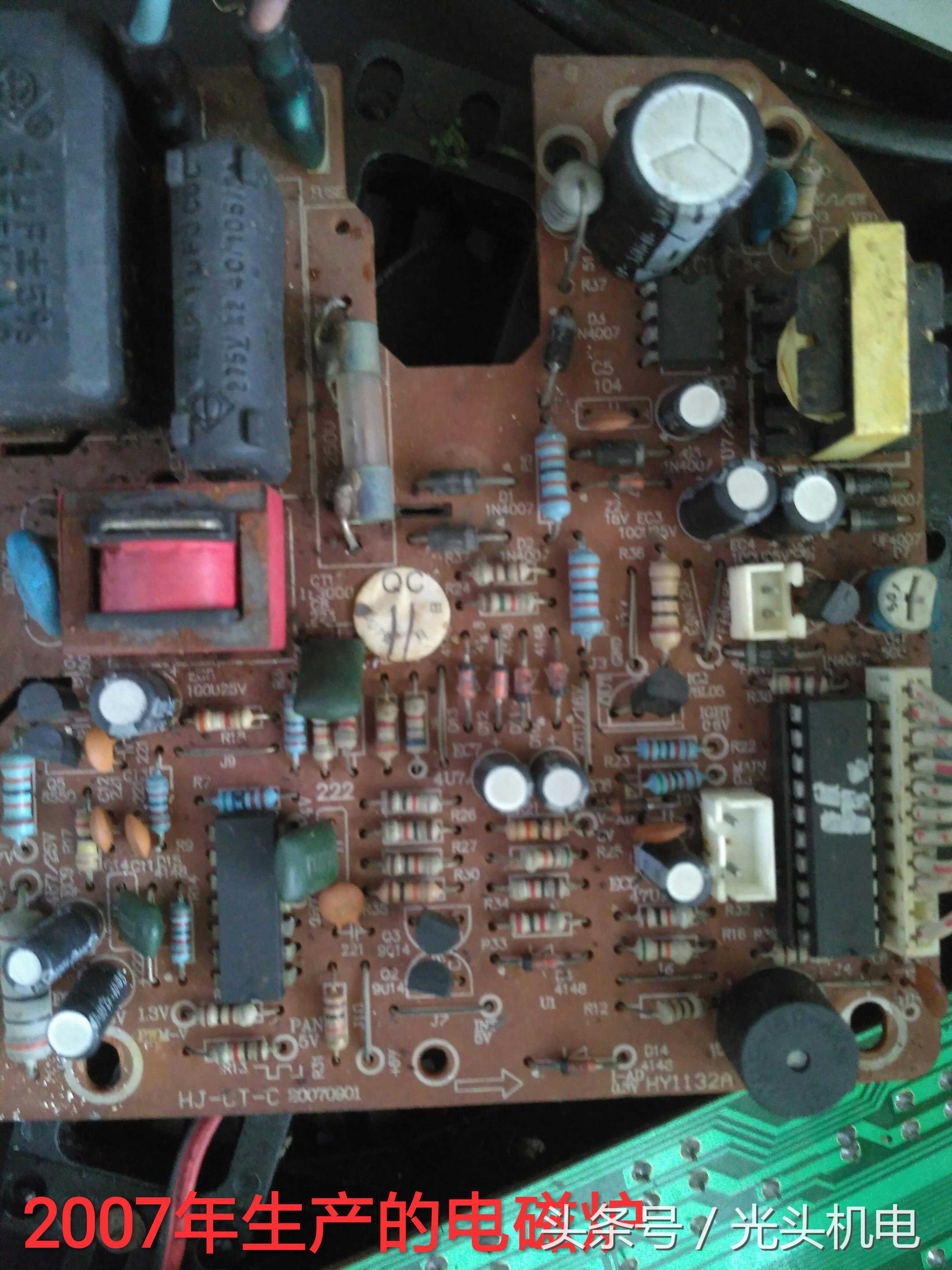 两款生产年代,品牌都不相同的电磁炉,工作原理都是把输入的市电通过一定的电子元件,使励磁线圈在铁质锅底产生涡流,产生热量,加热食物。