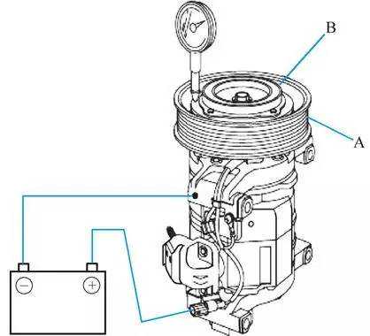 ③用千分表测量皮带轮A和压盘B之间的间隙。对千分表调零,然后对空调压缩机离合器施加蓄电池电压。施加电压时测量压盘的移动。