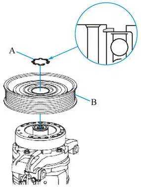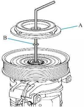 ③如果更换励磁线圈,则用卡环钳拆下卡环A,然后拆下皮带轮B。小心不要损坏皮带轮或空调压缩机。