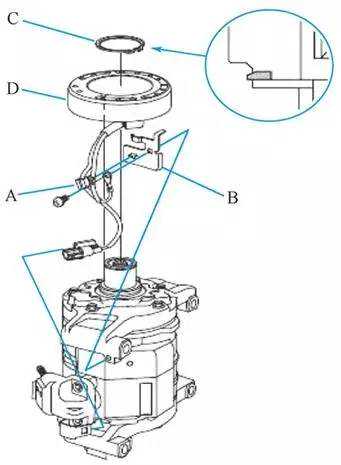 ④拆下螺钉、线束夹A和固定器B。使用卡环钳拆下卡环C,然后拆下励磁线圈D。小心不要损坏励磁线圈或空调压缩机。