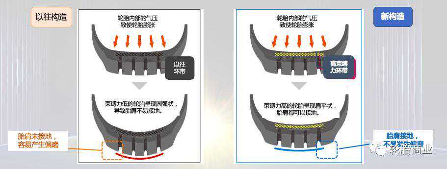 其次,该款产品的胎面橡胶优化了橡胶种类和补强材料(炭黑)的使用量,尽可能地抑制了磨损。通过进一步地降低橡胶发热性,实现降低滚阻从而减少油耗。另外,胎面内部采用新的结构——高束缚力环带,提升胎面刚性,并使胎面更加扁平化,从而实现胎肩牢牢接地,提升耐偏磨性能。